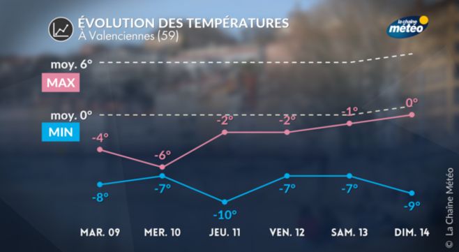 Avec la présence de neige au sol, du froid en altitude et du rayonnement la nuit, les températures pourront chuter en dessous de -10°C la nuit sur les Hauts-de-France. L'après-midi, il n'y aura aucun dégel de lundi à samedi prochain au nord d'une ligne Le Havre / Metz.