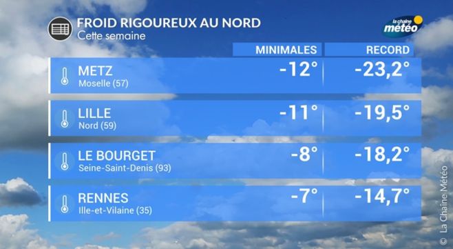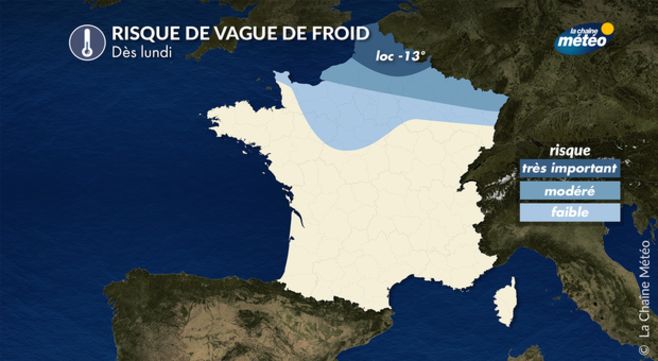 Avec des températures inférieures de 5°C aux normales et plusieurs journées consécutives sans dégel, les régions les plus au nord (Haute-Normandie et Hauts-de-France) seront bien touchées par une vague de froid. La nuit, les températures s'abaisseront entre -5 et -10°C en plaine, avec localement -12 à -15°C sur l'Artois. Sur les régions limitrophes (Basse-Normandie, bassin parisien, Champagne et Ardennes), le temps s'annonce durablement froid mais on devrait rester légèrement sous les seuils d'une vague de froid.