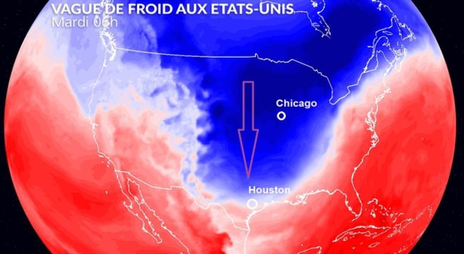 Cette tempête de neige sera suivie de l'arrivée d'un air glacial depuis le Canada vers le sud des États-Unis. Les températures vont littéralement s'effondrer jusqu'à près de -25°C au nord du Texas. On estime que tous les Etats centraux des USA (de la frontière canadienne au Middle West, au Kansas et au Texas) enregistrent des températures inférieures de 20°C aux moyennes, à tel point que l'OMM (Organisation Météorologique Mondiale) a déclaré, dans un tweet, que plus de 100 millions d'américains étaient directement impactés par des conditions de froid extrême et dangereux.