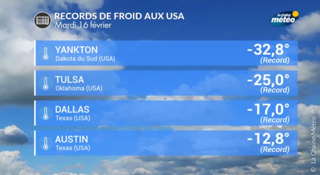 On a relevé par exemple -25°C à Tulsa (Ok), un record absolu, -32,8°C à Yankton (Dakota du Sud), autre record absolu, -17°C à Dallas (record mensuel, température la plus basse depuis 72 ans), -12,8°C à Austin (Texas, à l'intérieur des terres), -6,7°C à Corpus Christi (Texas, sur le littoral) et -3,3°C à la Nouvelle-Orléans (Louisianne), ce qui n'est pas exceptionnel dans ce cas.