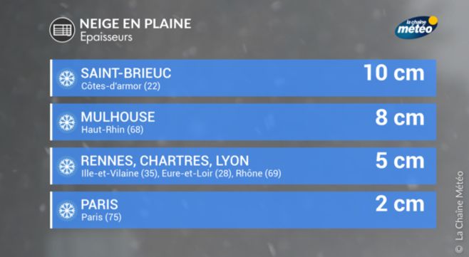 Mardi, une perturbation a apporté des chutes de neige importantes dans le nord-ouest de la France avec 10 à 15 cm sur le nord des Côtes-d'Armor, entre Saint-Brieuc et Lannion notamment, 5 à 10 cm du nord de l'Ille-et-Vilaine au Loiret et de 2 à 5 cm du sud de Paris à la Lorraine. Avec 5 cm de neige sur Rennes, il faut remonter au 28 janvier 2006 pour retrouver un épisode neigeux aussi important dans cette ville.