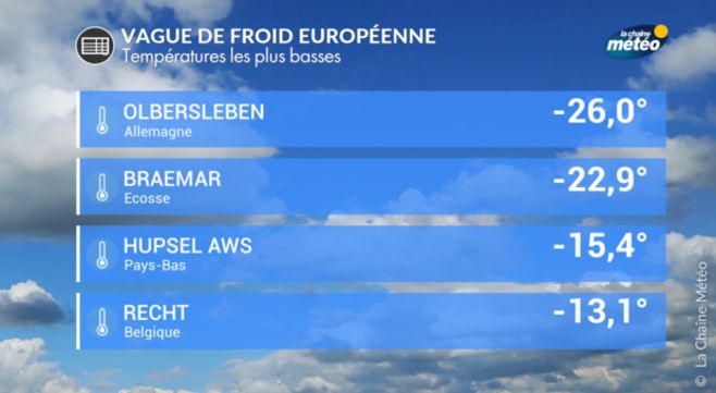 Si le nord de la France a connu une vague de froid d'intensité modérée, le froid s'est montré plus rigoureux et exceptionnel sur l'Allemagne, le Benelux et les îles britanniques. En Allemagne, le thermomètre est descendu à -26,7°C à Mülhausen en Thuringe et -23,1°C à Göttingen en Basse Saxe. Aux Pays-Bas, la température la plus basse a atteint -15,4°C à Hupsel Aws. Tous les canaux ont gelé, ce qui n'était plus arrivé depuis janvier 2013, ce qui a fait la joie des patineurs. En Écosse, le thermomètre a plongé à près de -19,7°C à Altnaharra et -12,6°C à Édimbourg, une valeur qui n'avait plus été atteinte depuis décembre 2010. A Braemar, village situé dans le nord-est de l'Ecosse, la température est descendue encore plus bas, à -22,9°C : il s'agit de la plus basse température relevée en février... depuis février 1956 pour les îles britanniques ! Enfin en Suisse, si la vague de froid a été de courte durée (2 jours), la température a plongé à -44,4°C à Glattalp (1850 mètres d'altitude) dans l'est du pays dimanche matin !