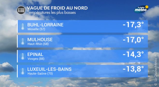 En plaine, les températures les plus basses pendant cette vague de froid ont été mesurées dans le nord de la France, à Mulhouse (68) avec -17,0°C ce dimanche matin et Buhl-Lorraine (57) avec -17,3°C jeudi dernier.