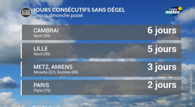 Ainsi Lille a connu 5 journées sans dégel. Il faut remonter à la vague de froid de fin décembre 1996 - début janvier 1997, pour retrouver une période sans dégel aussi longue. A Paris, l'année 2020 a compté 6 jours de gel. Ce chiffre vient d'être dépassé en seulement une semaine : du lundi 8 au dimanche 14 février il a gelé 7 jours d'affilée. En Bretagne, les journées de mardi, mercredi et jeudi ont été parmi les pus froides enregistrées au niveau régional depuis janvier 1987.