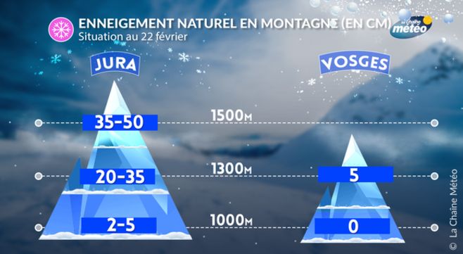 L’enneigement était exceptionnel sur les Vosges durant la fin décembre et jusqu’au mois de janvier inclus, en raison de fréquentes et fortes chutes de neige. Néanmoins, le dernier redoux aura eu raison de cet épais manteau blanc. Tout est repassé au vert sous 1000 à 1200 mètres d’altitude. Seuls les sommets conservent un fin manteau blanc (5 cm) en versant nord. Du côté du Jura, le manteau neigeux est mieux fourni, en particulier au-delà de 1300 mètres où l’épaisseur en versant nord dépasse 35 cm.