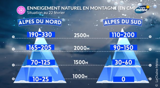 L’enneigement des Alpes souffre également de ce redoux très marqué, en particulier à cause du vent de sud récurrent ces dernières semaines. Dans les Alpes-du-sud, l’enneigement était déjà déficitaire en janvier. Il faut désormais monter au-delà de 1500 mètres pour trouver de la neige en versant nord. Les quantités sont très variables selon les massifs avec au moins 30 cm à 1500 mètres et au-plus 60 cm. Dans les Alpes-du-nord, l’enneigement reste bien plus important avec quelques dizaines de centimètres dès 1000 mètres et jusqu’à 125 cm à 1500 mètres. En haute montagne, on trouve jusqu'à 1m90 à 3 mètres d'une neige de bien meilleure qualité.