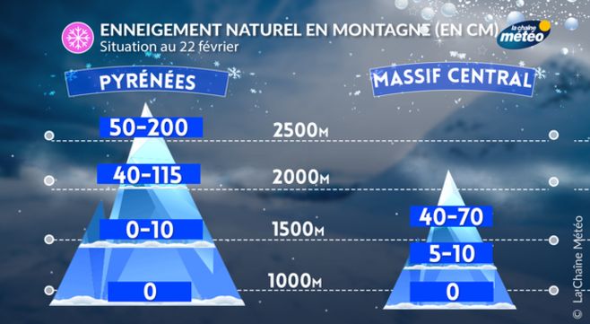 Le massif Pyrénéen souffre particulièrement du fort flux de sud installé depuis ces 10 derniers jours. Ce dernier a fait passer au vert les versants nord en-dessous de 1000 à 1200 mètres. Il faut aller au-delà de 1500 mètres pour trouver les premiers centimètres et au-delà de 2000 mètres pour trouver une épaisseur supérieure à 40 cm à l’est de la chaîne et 115 cm à l’ouest. En effet la partie occidentale de la chaîne reste à ce jour plus enneigée que la partie orientale. Enfin, le massif central qui connaissait jusqu’à la mi-février un enneigement exceptionnel, du moins en Auvergne, a vu son manteau neigeux fondre en raison du redoux et des grands coups de vent de sud. Au-dessus de 1300 mètres, on trouve ainsi plus que 5 à 10 cm en versant nord et 40 à 70 cm sur les sommets.
