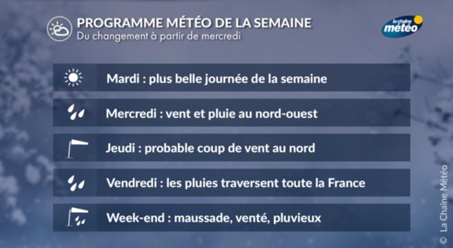Après un début de semaine assez froid avec de fréquentes gelées sur les 2/3 du pays le matin, le vent s'orientera au sud-ouest sous l'influence des perturbations atlantiques mercredi. Les températures remonteront et le risque de gelées en plaine disparaîtra totalement jeudi matin. L'après-midi, les maximales afficheront 10 à 14°C en 2ème partie de semaine, mais en raison du vent, des pluies et des averses, le ressenti ne sera pas très agréable.