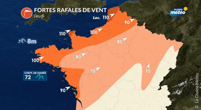 En journée de jeudi, c'est une large moitié nord-ouest du pays qui sera concerné par un temps agité avec des rafales de vent généralement comprises entre 70 et 80 km/h dans les terres, localement 90 à 100 km/h sur un axe allant de la Bretagne aux Hauts-de-France.