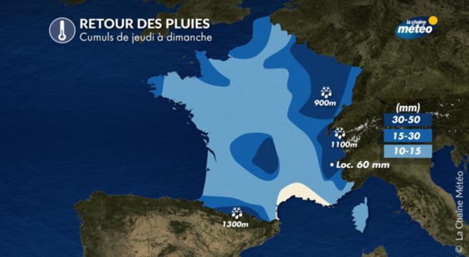Au cours des prochains jours, les perturbations retrouveront le chemin de la France et concerneront surtout les deux tiers nord du pays. Les régions méditerranéennes resteront à l'écart de la pluie. Entre jeudi et dimanche, on attend en moyenne 10 à 15 millimètres en plaine mais les cumuls seront plus importants près de la Manche et sur les régions du nord-est avec 15 à 30 millimètres et même 30 à 50 mm des Ardennes aux Vosges ainsi que du Jura aux Alpes. Ce retour de la pluie sera de bon augure pour les cultures et jardins.