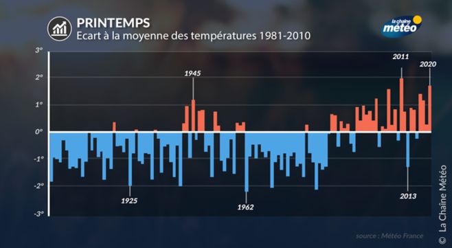 Si les printemps frais ne sont donc pas exceptionnels, ils sont tout de même caractérisés par une forte tendance au réchauffement depuis la décennie 1990/2000 dans le contexte du changement climatique contemporain. Les printemps très frais étaient quasiment la norme entre 1960 et les années 1980, où la neige tombait fréquemment en plaine pour Pâques, en avril. Désormais, la fréquence des printemps frais diminue nettement pour laisser place à des printemps précoces, rapidement chauds et secs. Depuis les années 2000, ils sont devenus la norme. Malgré tout, la variabilité naturelle existe et des printemps frais peuvent encore se produire, comme on le voit en ce mois de mars. Mais, dans la perspective du réchauffement climatique, ces printemps frais semblent devenir plus rares, ce qui contribue, entre autres, à raccourcir la saison de neige en montagne et à engendrer des situations de sécheresse pénalisante avant d’aborder l’été.