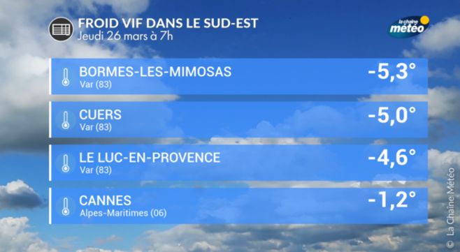 Ce vent de nord à nord-est concernera de nombreuses régions car la France se situera entre un anticyclone sur le nord de l'Europe et une dépression en Méditerranée d'où un effet de canalisation de l'air froid sur notre pays. Si les températures de vendredi au lever du jour seront encore positives (0 à 5°C) sur la plus grande partie du pays, avec le vent qui soufflera à 40-50 km/h en rafales, les températures ressenties seront négatives dans le nord et l'est.