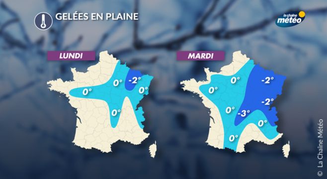 Mardi matin, suite à une nuit étoilée, les gelées seront à nouveau plus marquées et étendues aux ¾ du pays, des frontières de l’Est au sud-ouest avec -5°C dans les vallées d’Auvergne et jurassiennes.