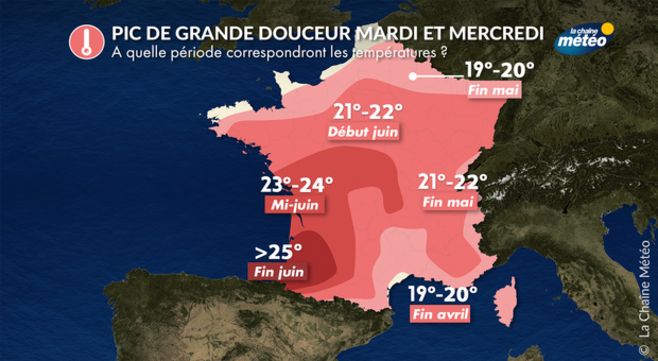 Alors que le temps est encore un peu mitigé samedi, en particulier sur les 2/3 nord du pays avec un temps nuageux et quelques précipitations au nord de la Loire, l’amélioration se fera sentir dès dimanche grâce à cette nouvelle poussée anticyclonique par le sud. Le flux commencera à s’orienter progressivement au sud tout en se renforçant en début de semaine prochaine. La masse d’air en altitude (1500 mètres) se réchauffera alors subitement pour atteindre jusqu’à 12°C sur le sud-ouest mardi et mercredi prochain. Pour ces deux journées, on attend donc entre 15 et 20°C des côtes de la Manche aux régions au nord de la Seine, 21 à 22°C du sud de la Bretagne au Grand-Est, en passant par le bassin Parisien et jusqu’à plus de 25°C au sud-ouest. Nous serons alors entre 4 à 8°C au-dessus des normales des côtes de la Manche au sud-ouest.