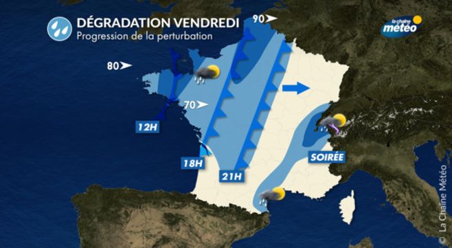 Ce vendredi, les conditions météo se dégradent par le nord-ouest avec l'arrivée d'une perturbation plus active que la précédente. Les pluies ou averses traversent la Bretagne le matin puis les Pays de la Loire et la Normandie l'après-midi avant de toucher le sud-ouest, le Bassin parisien et les Hauts-de-France en fin de journée. Le temps reste calme et sec dans l'est et le sud-est.