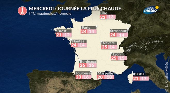 A cette époque de l'année, les records absolus de chaleur pour une fin mars sont déjà assez élevés (25,7° à Paris et 27,7°C à Bordeaux, ainsi que 31,5°C à Pau). On ne les atteindra pas. Cependant, certaines zones pourront les approcher, voire les battre là où ils sont moins élevés. Ce pourrait être le cas du centre-ouest de la France (Centre, Val de Loire, Beauce), voire de la Bretagne et de la Normandie. Certaines localités du sud-ouest pourraient aussi frôler ces records. Ainsi, il faisait déjà près de 27°C à Cazaux (33) ce lundi, alors que le record est de 28,6°C en 1955. A Rouen, on relevait 22°C ce lundi après-midi alors que le record y est de 22,3°C en 2005. Il est donc possible que les températures gagnent encore 1 à 2°C d'ici à mercredi après-midi, permettant de battre certains records entre Centre-Val-de-Loire, Bretagne et Normandie. La journée la plus douce à l'échelle de l'hexagone sera mercredi, avec une moyenne nationale pouvant frôler le record du 30 mars 2017 (23,2°C).