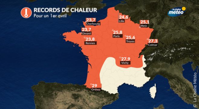 Ainsi, la période s'étendant du 29 mars au 1er avril constitue une série inhabituelle de jours de chaleur sur notre pays (c'est à dire avec des températures atteignant et dépassant la barre des 25°C) du sud-ouest à l'est, mais surtout au nord-ouest du pays, où cette situation est devenue exceptionnelle en Bretagne par exemple. On explique cette chaleur en Bretagne par la provenance du flux : les vents faibles venant du secteur sud à sud-est ont dirigé l'air chaud et sec venant des terres jusque sur les côtes nord de la Bretagne, où les records on été battus jusque sur les plages de Dinard (35) et de Saint Caast le Guildo (22) par exemple. Le jeudi 1er avril a été la journée la plus chaude de la série où la température a atteint 27,6°C à Brest (29), constituant ainsi le 1er avril le plus chaud jamais enregistré et surtout la deuxième après-midi la plus chaude jamais observée en avril en 77 ans de mesure à Brest après le record absolu qui reste de 28,2°C le 15 avril 2015.