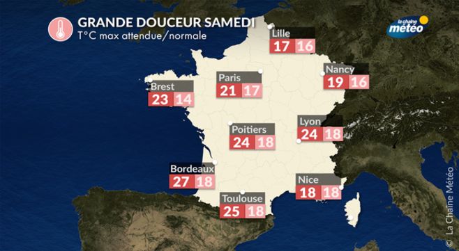 Ce samedi matin, il fait frais au nord de la Seine avec des minimales entre 1 et 5°C des Hauts-de-France au Grand Est. Il fait plus doux au sud de la Garonne avec 10°C en moyenne. Cet après-midi, les maximales afficheront 13 à 17°C de la Manche à la Belgique, 21°C à Paris, 23°C à Lyon et plus de 25°C du centre-ouest à l'Aquitaine. Dimanche, il fera moins frais au nord le matin et les maximales baisseront un peu dans le sud-ouest. Ailleurs elles évolueront peu par rapport à ce samedi.