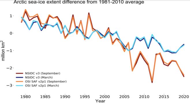 En 2020, l'étendue minimale de la banquise arctique après la fonte estivale était de 3,74 millions de km2. Ce n'est que la deuxième fois qu'elle recouvrait moins de 4 millions de km2. Elle a également atteint des minima record en juillet et en octobre.