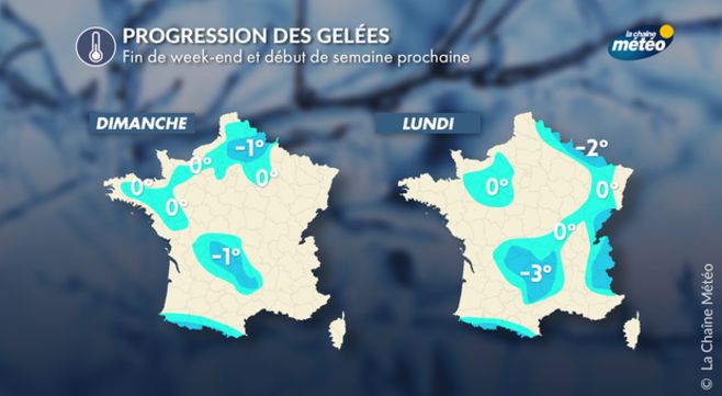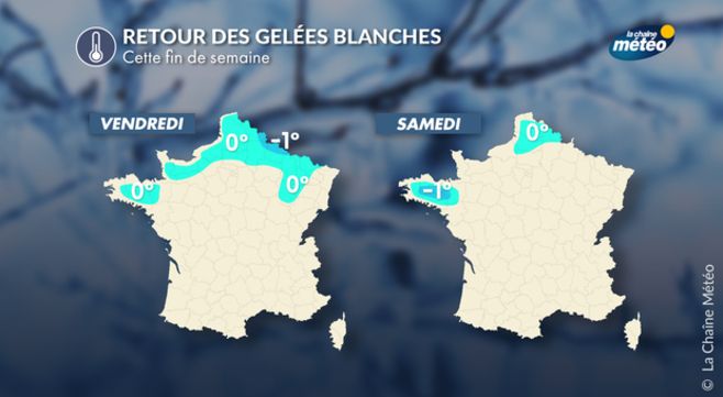 Pour que les nuits soient propices au gel, il faut que le ciel soit dégagé : cela favorise le rayonnement nocturne. C'est déjà localement le cas au nord de la Loire dès ce vendredi matin avec par exemple -3°C de minimale à Charleville-Mézières (08). On observera le retour des gelées blanches de la Bretagne aux Ardennes, dans les campagnes, avec des valeurs proches de 0°C à localement -2°C sous-abri.