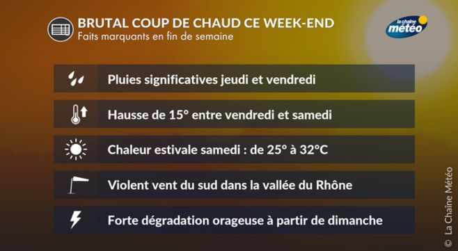 Comme souvent en cette période d'intersaison entre l'hiver et l'été, les conditions météo changent rapidement. Après un flux océanique d'ouest apportant un temps passagèrement perturbé dans la semaine, le flux va se redresser au secteur sud pour le week-end se caractérisant par une nette hausse des températures.