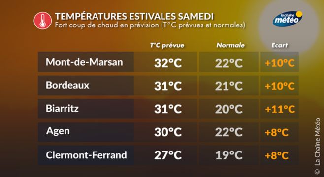 C'est dans le sud-ouest que la chaleur sera la plus intense samedi avec des pointes à 31-32°C possibles dans les Landes ainsi que sur le piémont pyrénéen. On se situera alors à 10°C au-dessus des normales pour cette époque de l'année. La chaleur remontera vers les régions centrales et l'Auvergne avec des pointes à 27-28°C sur des villes comme Poitiers, Clermont-Ferrand ou Vichy. Plus au nord, on approchera les 25°C à l'ombre en fin d'après-midi sur le Bassin parisien. Les valeurs seront généralement comprises entre 22 et 25°C du nord au nord-est. L'extrême nord-ouest pourrait rester à l'écart de ces remontées d'air chaud.
