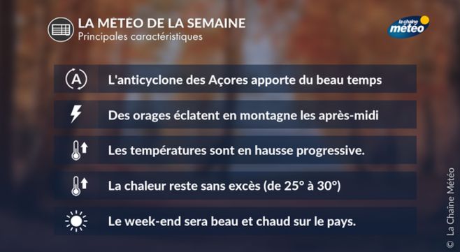 Cette semaine, l'anticyclone des Açores est aux commandes. Il vient se positionner sur le golfe de Gascogne et nous apporte un temps ensoleillé et chaud. Quelques ondées orageuses sont toutefois à surveiller, surtout en montagne les après-midis.