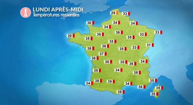 Après une nuit déjà très douce, parfois pesante dans les grandes villes d'Aquitaine et méditerranéennes avec 17 à 23°C en moyenne (alors que vous avez gardé un peu de fraîcheur au nord de la Seine avec 9 à 13°C au lever du jour), la chaleur augmentera rapidement, dès le lever du soleil. L'après-midi, on attend 30 à 35°C en moyenne avec des pointes vers 36 à 38°C localement sur le sud-ouest. Seuls les bords de Manche respireront mieux en raison d'un peu de brise.