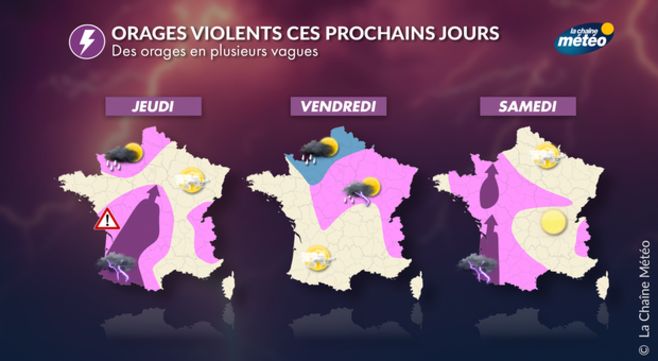 - des orages violents du sud-ouest au centre cet après-midi puis de l'Ile-de-France au Nord en fin de journée.