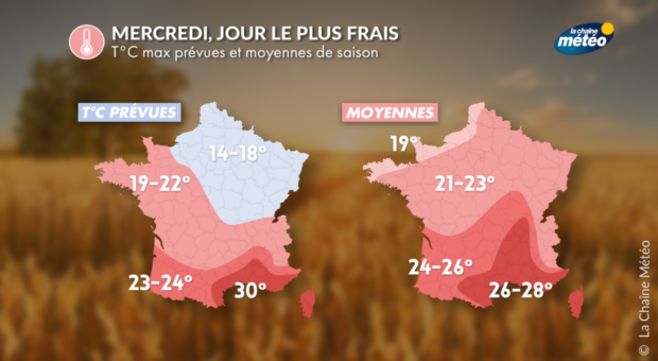 L'air frais océanique gagne du terrain vers l'est. L’air frais l’emportera mardi par l’ouest et mercredi sur toute la moitié nord. Mercredi sera la journée la plus fraîche. Le pourtour méditerranéen conserve des températures estivales, avec du vent parfois fort et sous le soleil. Les températures maximales afficheront en milieu de semaine entre 16 et 24°C en général mais jusqu’à 30°C en Provence. Les températures remonteront par l’ouest et le sud à partir de jeudi pour redevenir de saison sur l"ensemble de l'hexagone vendredi.