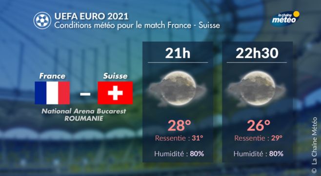 Petit bonus spécial foot Euro 2021 : le temps sera très chaud et lourd pour le match France-Suisse ce soir à 21h (22 heures locales) qui se déroule à Bucarest, en Roumanie. L'ambiance sera chaude.