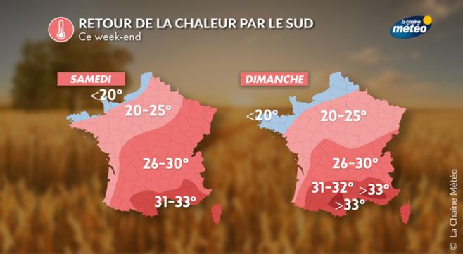 Sous les nuages et les pluies au nord ce samedi, les températures affichent des valeurs en-dessous des normes, avec 17 à 23°C des côtes de la Manche au niveau de la Loire. Sur le nord-est il fait assez chaud avant l'arrivée des orages en fin de journée avec 24 à 27°C. Dans le sud et grâce à un bon ensoleillement, il fait plus chaud avec 24 à 34°C. Demain dimanche, le soleil revenant au nord, les températures maximales seront en hausse avec 21 à 27°C sauf de la pointe bretonne au Cotentin où il ne fera pas plus de 16 à 19°C. Au sud, la chaleur s'intensifiera notamment du sud-ouest à la Provence avec 27 à 38°C.