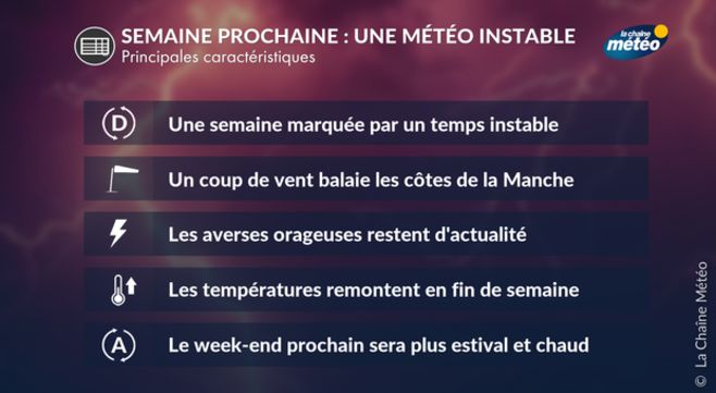 Les hautes pressions ont beaucoup de mal à s'imposer. C'est un flux de sud-ouest à ouest instable qui concerne une grande partie du pays cette semaine, avec une alternance de périodes de temps sec et de dégradations pluvio-orageuses qui balayeront les 3/4 du pays, le sud-est restant en marge du mauvais temps. Les températures seront fluctuantes au gré du passage des orages.