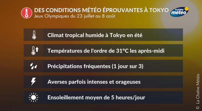 Reportés d'un an en raison de la pandémie de COVID-19, les Jeux Olympiques de Tokyo débuteront ce vendredi 23 juillet pour se terminer le dimanche 8 août. Ils se tiendront à huit clos, sans spectateurs, et rassembleront près de 11000 athlètes du monde entier au sein de 33 disciplines olympiques. A cette époque de l'année, les conditions climatiques y sont particulièrement difficiles avec des températures élevées et une forte humidité liée aux fréquentes précipitations.