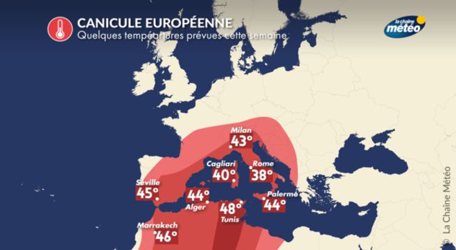 Cette semaine, un vaste anticyclone accompagné d'air brulant recouvre le Maghreb, la Méditerranée occidentale et s'étend jusqu'à l'est de l'Espagne et l'Italie en frôlant le sud-est de la France. Dans ce contexte, des records de chaleur historiques sont battus, dont possiblement celui de la plus haute température mesurée en Europe. Voici les principales caractéristiques de l'évolution attendue.