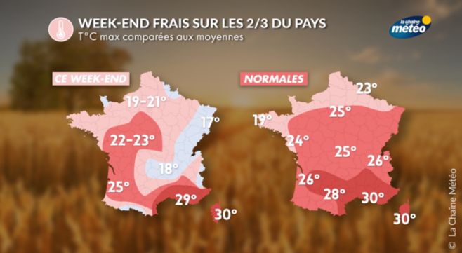 Le matin, les températures minimales seront contrastées et s'échelonnent de 7 à 10 °C dans le nord et le centre de la France où la fraîcheur est particulièrement sensible à 16 à 20 °C aux abords de la Méditerranée. L'après-midi, les maximales se montrent contrastées, fraîches au nord de la Seine et ayant parfois du mal à dépasser les 17 à 20 °C, plus estivales en allant vers l'ouest et la Méditerranée avec 24 à 29 °C, jusqu'à 30 à 32 °C en pointe dans l'arrière-pays provençal.