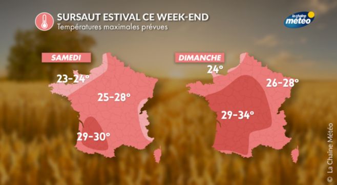 En raison du flux général qui s'oriente au secteur sud, les températures sont orientées à la hausse. Samedi après-midi, on attend 23 à 28 °C sur la moitié nord et de 26 à 32 °C au sud. Dimanche, les températures seront encore en hausse avec 23 à 31 °C au nord et de 27 à 34 °C au sud.