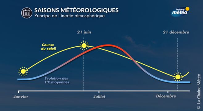 Nous observons un décalage des températures par rapport à la course du soleil, car l’atmosphère, et a fortiori les océans, marquent un certain délai avant de se réchauffer ou de se refroidir. C’est le principe de l’inertie. Ainsi, si le soleil est au zénith le 21 juin dans l’hémisphère nord, jour du solstice d’été, l’atmosphère absorbe encore davantage de chaleur pendant quelques semaines. Par conséquent, dans nos latitudes tempérées comme la France, la période la plus chaude de l’année est, statistiquement, fin juillet. De même, pour l’hiver, alors que le solstice est le 21 décembre, il faut encore du temps pour que l’atmosphère, la surface terrestre et les mers se refroidissent encore. Ce refroidissement abouti à la période la plus froide de l’année autour du 10 janvier. Il y a donc un décalage dans les saisons météorologiques pour ces simples raisons. C’est la raison pour laquelle, en automne, nous pouvons encore bénéficier de belles journées estivales, voire de vagues de chaleur tardives, comme en 2020.