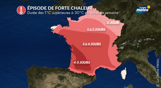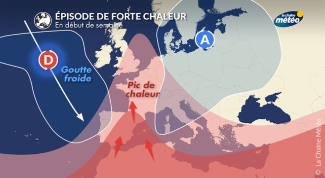 En début de semaine, la France reste sous l'influence d'un vent du Sud, canalisé entre un anticyclone sur l'Allemagne et une dépression atlantique, avec un épisode de fortes chaleurs. Puis à partir de ce mercredi près de l'Atlantique et jeudi dans l'est, des orages traverseront la France, apportant une baisse des températures à leur passage.