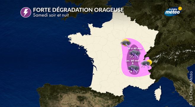 De la Normandie au Centre-Val de Loire, Auvergne, les éclaircies sont présentes le matin puis les nuages sont de plus en plus envahissants. Ce ciel menaçant finira par donner de fortes averses et parfois des orages l'après-midi. Il conviendra d'être vigilant entre l'Auvergne, la vallée du Rhône et de la Saône en fin d'après-midi et soirée, où les orages seront forts et persisteront la nuit avec d'importants cumuls de pluie.