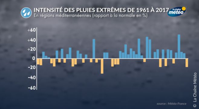 Avec le réchauffement climatique contemporain, de nombreuses questions se posent sur l’évolution de ces épisodes méditerranéens en termes d’intensité et de fréquences. Les chercheurs se sont penchés sur l’analyse des données disponibles des stations météo sur ces dernières décennies, pour en dégager une tendance éventuelle. Les résultats ont ainsi montré une intensification de 22% des fortes précipitations quotidiennes entre 1961 et 2015, mais avec une très forte variabilité interannuelle qui explique la forte incertitude sur l’ampleur de cette intensification. In fine si aucune tendance réelle sur leur fréquence d’occurrence ne se dégage, il semble que la fréquence des épisodes méditerranéens les plus forts (cumuls > 200 mm) augmente. Il y aurait donc une intensification de ces phénomènes météorologiques sur le bassin Méditerranéen, mais sans certitude que ces derniers se multiplient en lien avec le réchauffement climatique contemporain.