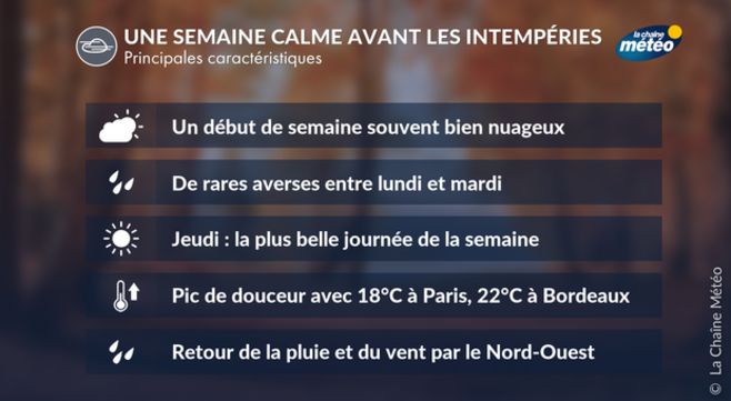 Les matinées seront assez fraîches, avec quelques gelées blanches sur l'est et le centre du pays. L'après-midi, si les nuages bas se dissipent rapidement, il fera doux avec 15 à 20 °C du nord-est au sud-ouest, avec des pointes vers 23 °C sur le bassin aquitain et l'arrière-pays méditerranéen. Mais si les nuages bas résistent, les maximales pourront être moins élevées, notamment dans le nord-est jusqu'au val de Saône avec à peine plus de 10 °C au meilleur moment de la journée de mercredi à jeudi prochain.