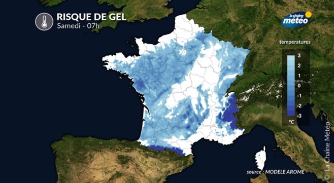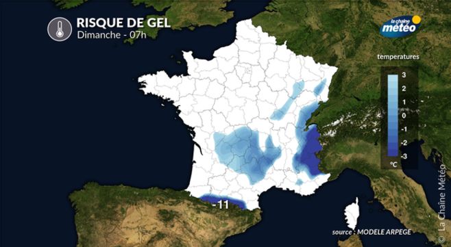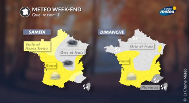 Il fera assez froid le matin avec des minimales entre -2 et 8 °C du nord-est aux rivages de la Méditerranée. La matinée la plus froide est celle de ce samedi, après une nuit dégagée, alors que demain dimanche, le ciel plus nuageux sur la moitié nord supprimera ces gelées. La baisse nocturne des températures sera en effet limitée en raison des nuages, mais en revanche, ces mêmes nuages vont freiner la hausse du mercure en journée, avec un ressenti frais et humide sur la moitié nord de la France. L'après-midi, les maximales afficheront de 8 °C en plaine d'Alsace à 15 °C dans le sud-est. On se situera sur les 3/4 du pays environ 1 à 2 °C sous les normales de saison.