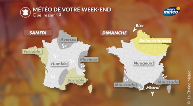 Ce week-end est plus perturbé, en raison du décalage de l'anticyclone à l'ouest des îles britanniques, ce qui laisse descendre une perturbation sur la France, en particulier sur le tiers nord-est du pays. Le retour d'un temps très nuageux, avec des pluies éparses, contraste avec le temps sec et souvent ensoleillé de la semaine. En Méditerranée, il convient de surveiller une nouvelle dégradation orageuse dimanche en Corse et sur une partie des Alpes du sud.
