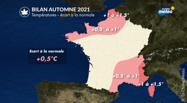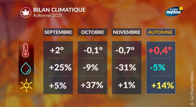 Au cours de cet automne météorologique, la température moyenne à l'échelle de la France a été supérieure de 0,5°C à la normale établie sur la période 1981-2010. Le mois de septembre a été chaud (+2°C) mais il a été suivi de mois d'octobre et de novembre légèrement plus frais que la normale (-0,1°C et -0,5°C).