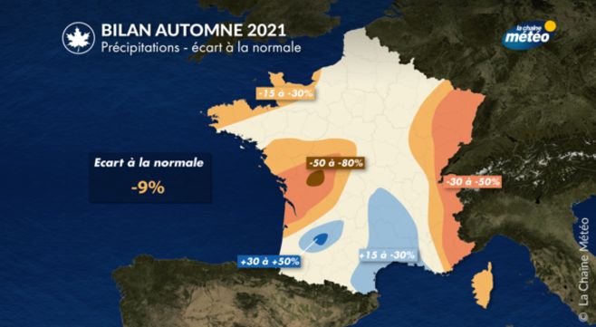 Si dans sa globalité l'automne 2021 a été assez sec avec un déficit proche de 10% en moyenne sur la France, les précipitations ont été très irrégulières et hétérogènes. Un important déficit pluviométrique concerne le centre-ouest du pays, de l'ordre de 65% à Poitiers (86), 60% à Cognac (16) alors qu'on observe un excédent de 28% à Nîmes (30) et 49% à Agen (47).