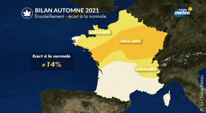 Avec la récurrence des conditions anticycloniques sur le nord de la France et le proche Atlantique en cet automne 2021, l'ensoleillement a été remarquable dans l'ouest et le nord du pays. L'excédent d'ensoleillement dépasse 30% sur un axe allant des Pays de la Loire au nord-est. Le mois d'octobre a été particulièrement ensoleillé avec des records mensuels d'ensoleillement battus sur des villes Nantes, Dijon, Rennes, Angers, Nevers, Cognac et Poitiers.