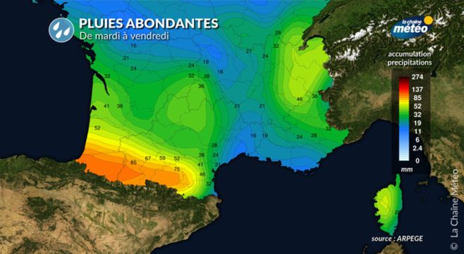 De mercredi à vendredi, on attend de fréquentes pluies et averses, surtout dans le sud-ouest. Ces pluies dites « efficaces » alimenteront les nappes phréatiques. D'une manière générale, les cumuls de pluies moyens seront généralement compris entre 20 et 50 mm sur le pays. Le relief pyrénéen recevra davantage de précipitations, avec 100 à 200 mm d'eau. La conjonction de ces très abondantes chutes de neige en montagne et des pluies répétées en plaine fera réagir de nombreux cours d'eau descendant des Pyrénées et du Massif central. Les niveaux de la Garonne et de ses affluents seront à surveiller, car cette situation pourrait entraîner des risques de crues et d'inondations sur le bassin aquitain.