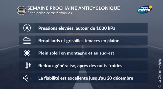 Après plusieurs semaines de mauvais temps, les conditions météo s'améliorent avec le retour d'un puissant anticyclone sur la France. Il assurera un temps très calme. Mais le soleil ne sera pas toujours au rendez-vous. Les brouillards et nuages bas seront encore nombreux ces prochains jours sur la moitié nord, tandis que le temps est quasi printanier au sud et sur nos montagnes.