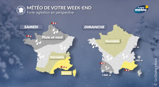 La #météo du #weekend s'annonce très perturbée en France et sur l'Europe de l'ouest en général. Les perturbations se succèdent, accompagnées de vents forts, de pluie et de #neige en moyenne #montagne. pic.twitter.com/eHmYQ40RGg